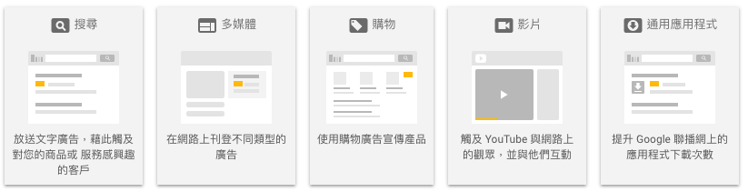 Google 廣告格式主要分為:搜尋、多媒體、購物、影片、應用程式,店家可以針對不同的曝光版位選擇不一樣的廣告格式,以下將會針對每一個廣告類別詳細說明。