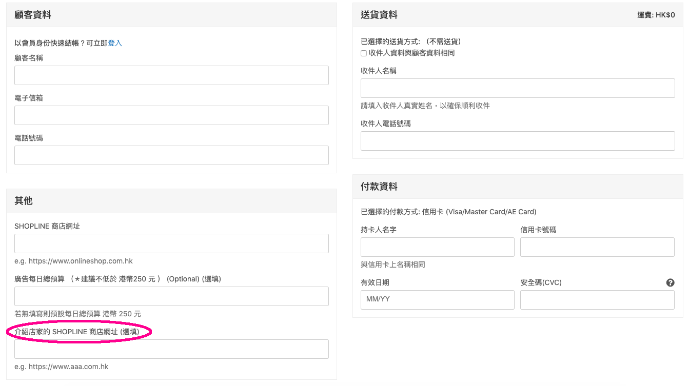新店家在網站下訂單時,於其他欄位的 【介紹店家的 SHOPLINE 商店網址】 中,填上你網店網址,當我們收到訂單後 ,便會通知你及將港幣$800加到你Google廣告帳戶中*,以作答謝。